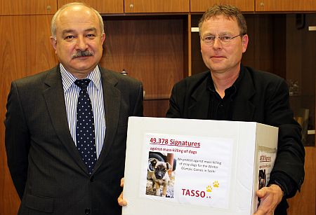 Die Tierschutzorganisation TASSO e.V. übergab Unterschriftenlisten an den russischen Generalkonsul Hattersheim, 24.10.2013 (profact) - 49.378 Tierfreunde sind dem Aufruf der Tierschutzorganisation TASSO gefolgt und haben sich mit ihrer Unterschrift gegen das Töten der Streunertiere in Sotschi ausgesprochen, dem Austragungsort der Olympischen Winterspiele 2014. Die Listen wurden gestern dem Generalkonsul der Russischen Föderation in Frankfurt, Ruslan Karsanov, übergeben. Medienberichten zufolge ist die Stadtverwaltung von Sotschi von der zunächst geplanten massenhaften Tötung streuender Hunde und Katzen zugunsten einer "humanen" Lösung abgerückt. Nicht zuletzt aufgrund massiver internationaler Proteste. "Wir alle hoffen, dass die Stadtverwaltung von Sotschi ihr Wort hält und tatsächlich auf Tötungsaktionen verzichtet", erklärte Mike Ruckelshaus, tierschutzpolitischer Sprecher von TASSO, anlässlich der Übergabe.